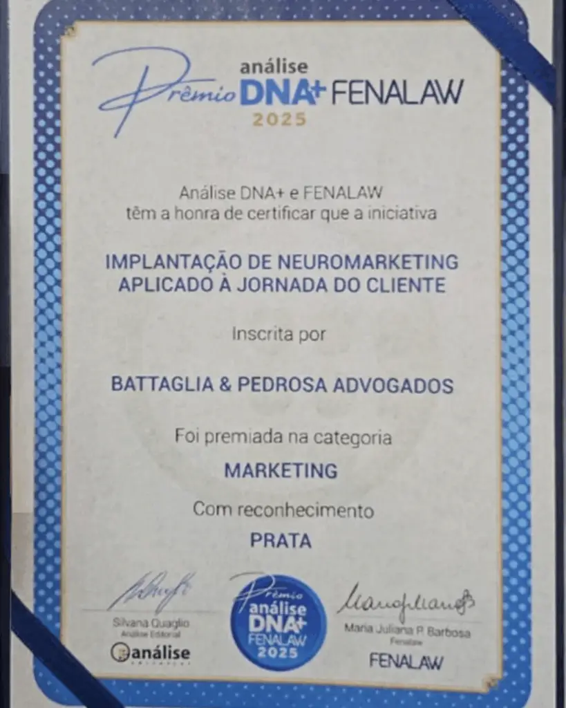 O escritório Battaglia & Pedrosa Advogados foi novamente reconhecido no Prêmio Análise DNA+Fenalaw, consolidando sua presença ao lado das principais bancas do Brasil. Nesta edição, o escritório recebeu o reconhecimento na categoria Prata, com o case “Implantação de neuromarketing aplicado à jornada do cliente”, liderado por Diego Parra, gerente de marketing do escritório.